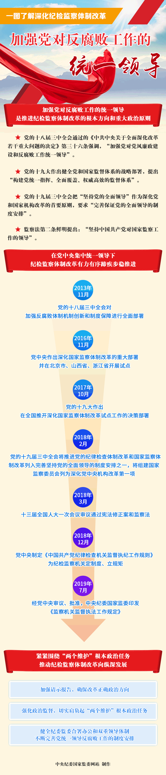 2018年2月,党的十九届三中全会将推进党的纪律检查体制改革和国家监察体制改革列入完善坚持党的全面领导的制度安排之一,将组建国家监察委员会列为深化党中央机构改革第一项任务……在党中央集中统一领导下,纪检监察体制改革取得重大阶段性成果,国家监察体系总体框架建立起来。