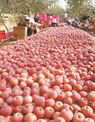 中国苹果产量目前占全世界产量55%左右。在陕西延长县,近年来科技扶贫推动了苹果产业发展。这是当地果农在果园里分拣包装苹果。(资料图片)