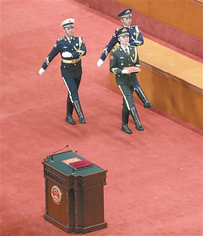 2018年3月17日,中华人民共和国第十三届全国人民代表大会第一次会议宪法宣誓仪式在北京人民大会堂举行。主席台上,3名礼兵迈着正步护送《中华人民共和国宪法》入场。新华社记者 庞兴雷 摄