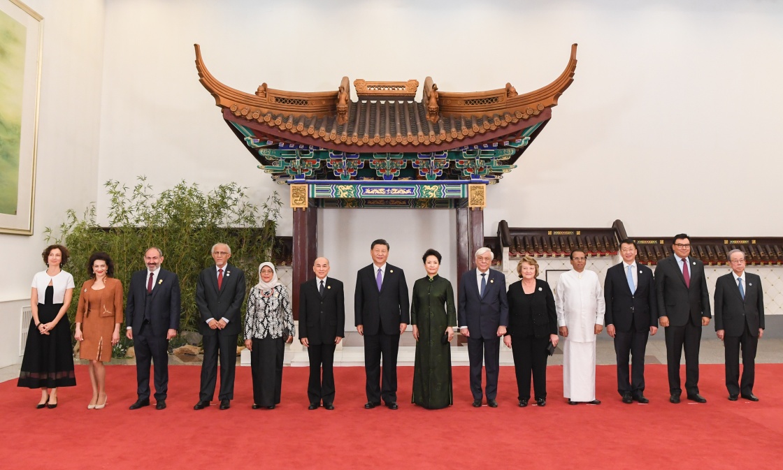 5月14日,国家主席习近平和夫人彭丽媛在北京人民大会堂举行宴会,欢迎出席亚洲文明对话大会的外方领导人夫妇及嘉宾。这是习近平和彭丽媛同外方领导人夫妇及嘉宾合影。 新华社记者 饶爱民 摄