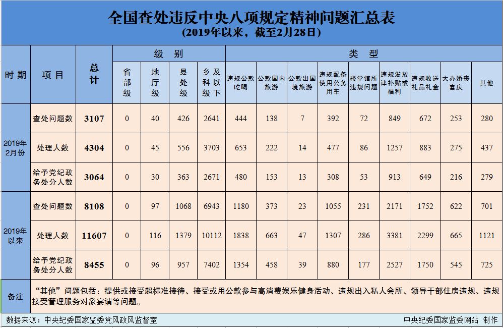 2019年2月全国查处违反中央八项规定精神问题3107起