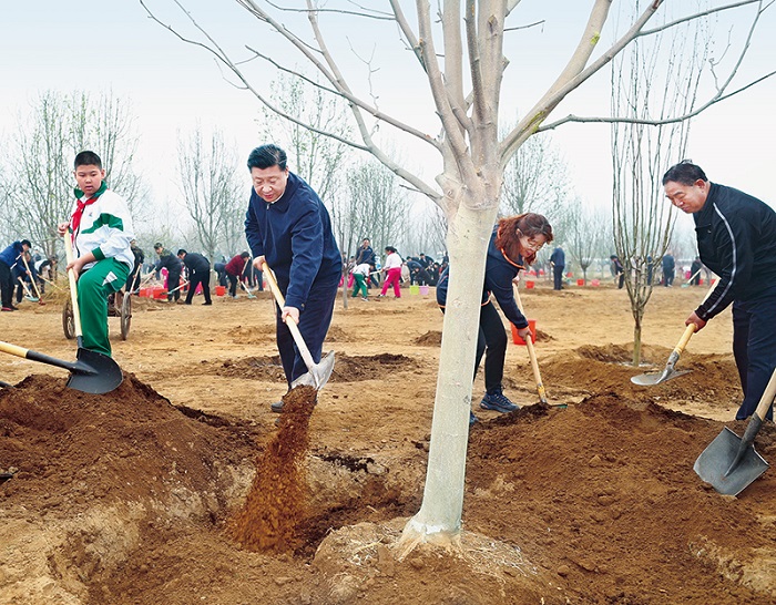 2018年4月2日,党和国家领导人习近平、李克强、栗战书、汪洋、王沪宁、赵乐际、韩正、王岐山等来到北京市通州区张家湾镇参加首都义务植树活动。这是习近平同大家一起植树。 新华社记者 谢环驰/摄