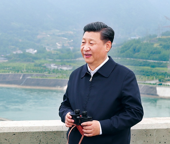 2018年4月26日下午,中共中央总书记、国家主席、中央军委主席习近平在武汉主持召开深入推动长江经济带发展座谈会并发表重要讲话。这是座谈会前,习近平于24日下午在三峡大坝坝顶察看三峡工程和坝区周边生态环境。 新华社记者 谢环驰/摄