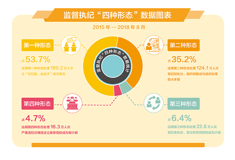 坚持惩前毖后、治病救人,坚持纪严于法、纪在法前,深化运用监督执纪“四种形态”,强化日常管理监督,抓早抓小、防微杜渐,发现问题及时纠正,防止小错酿成大错。数据来源:伟大的变革——庆祝改革开放40周年大型展览 孙彤/制图