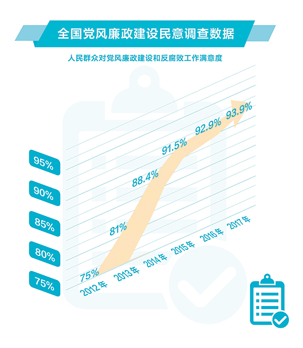 国家统计局问卷调查结果显示,党的十八大以来,人民群众对党风廉政建设和反腐败工作满意度逐年上升。数据来源:伟大的变革——庆祝改革开放40周年大型展览 孙彤/制图