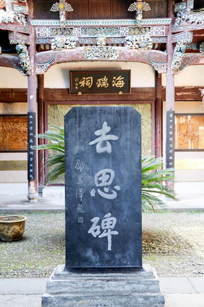 海瑞祠中还存有一块“去思碑”。碑的背面刻着《海刚峰先生去思碑记》。嘉靖四十一年(1562年),海瑞奉调离开淳安,恰逢淳安人徐廷绶考中进士荣归故里,淳安父老便请徐廷绶写怀念海瑞的碑记。徐廷绶早就敬慕海公为人,遂应乡亲之托,写下此文,追思海瑞的政德。