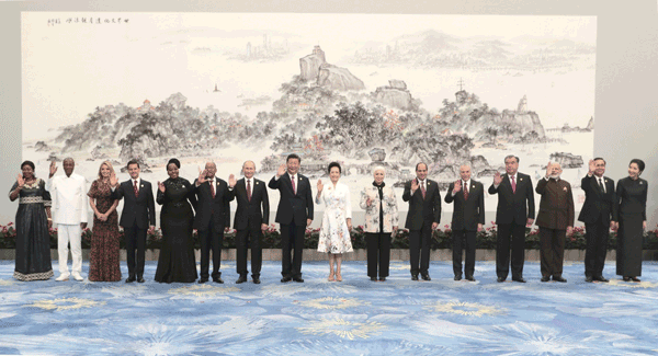 9月4日,国家主席习近平和夫人彭丽媛在厦门国际会议中心举行宴会,欢迎金砖国家和新兴市场国家与发展中国家对话会受邀国领导人及配偶、嘉宾。这是习近平和彭丽媛同各国领导人及配偶在巨幅水墨画“世界文化遗产鼓浪屿”前合影留念。(新华社记者 马占成 摄)