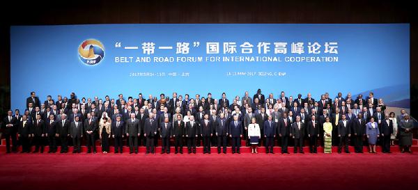 5月14日,国家主席习近平在北京出席“一带一路”国际合作高峰论坛开幕式,并发表题为《携手推进“一带一路”建设》的主旨演讲。这是习近平同出席“一带一路”国际合作高峰论坛的代表们合影。(新华社记者 庞兴雷 摄)