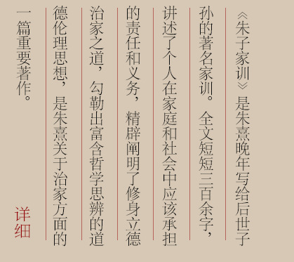 一代大儒朱熹把儒学精华和自身的教育思想融入到家规家训之中,写就三百余字的家训名篇《朱子家训》。八百多年来,朱熹后裔繁衍生息,已历经三十多代,子孙遍布各地,达数百万之众。然而不管身处何处,《朱子家训》始终是朱子后裔共同的人生指引。详细
