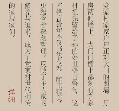 走进党家村,扑面而来的,是错落有致、精美绝伦的中国明清古民居,青砖灰瓦、鳞次栉比,瓦屋千宇、不染尘埃。但更让人感受深刻的是,在每家院落墙壁的青砖上,都镌刻着富含哲理的家训。这些家训与民居建筑融为一体,让子孙时时看得见、注意得到,在耳濡目染、潜移默化中将良好家风代代相传。详细