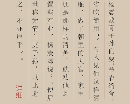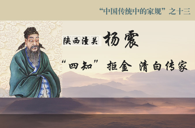 东汉太尉杨震以“天知、地知、你知、我知,四知拒金”而为人们津津乐道,又以“清白传家”被后世广为传颂。杨震不仅自身清廉正直而且还治家严谨、家风清白,他认为让后世人都称子孙为“清白吏”就是给子孙留下的最丰厚的遗产。详细